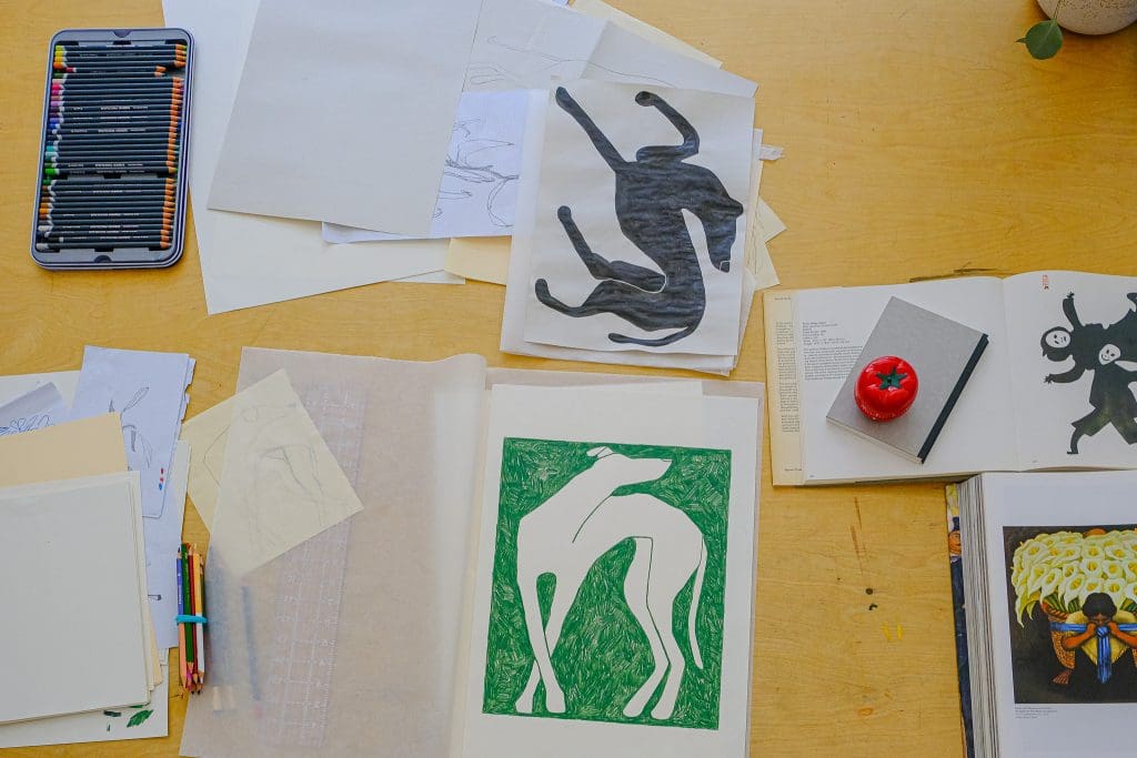 He estado trabajando en dibujos a lápiz y grabados en relieve hechos con matrices de madera, mientras establezco un estudio en Barcelona. Vivimos 8 años en Los Ángeles y ahora estamos al otro lado del mundo, así que estamos tratando de combinar el proceso de reconstruir el estudio con trabajar en algunos proyectos que nos interesan.