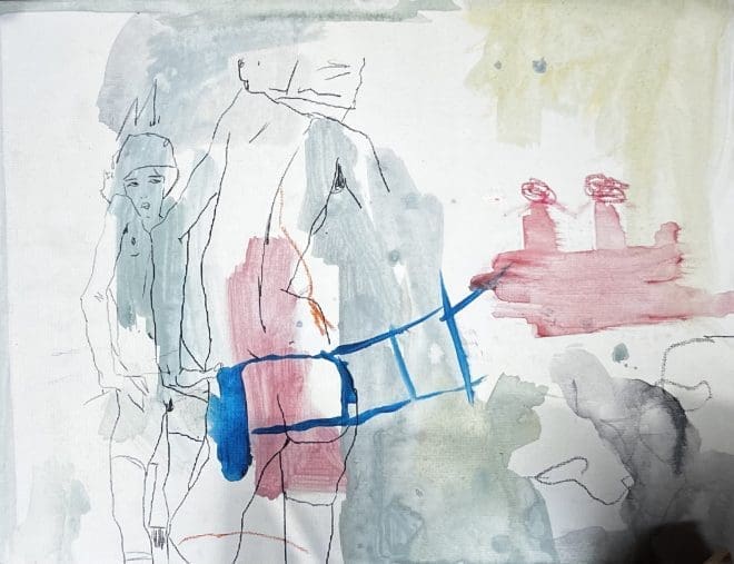 El proceso fue totalmente azaroso a partir de la mancha que definió la composición. El proceso termina con la línea y el dibujo, dotando a la pieza de calidad de línea y cierto estatismo que dialoga a la perfección con la textura acuosa de la acuarela. La obra es de formato pequeño, yo suelo trabajar en formato grande.