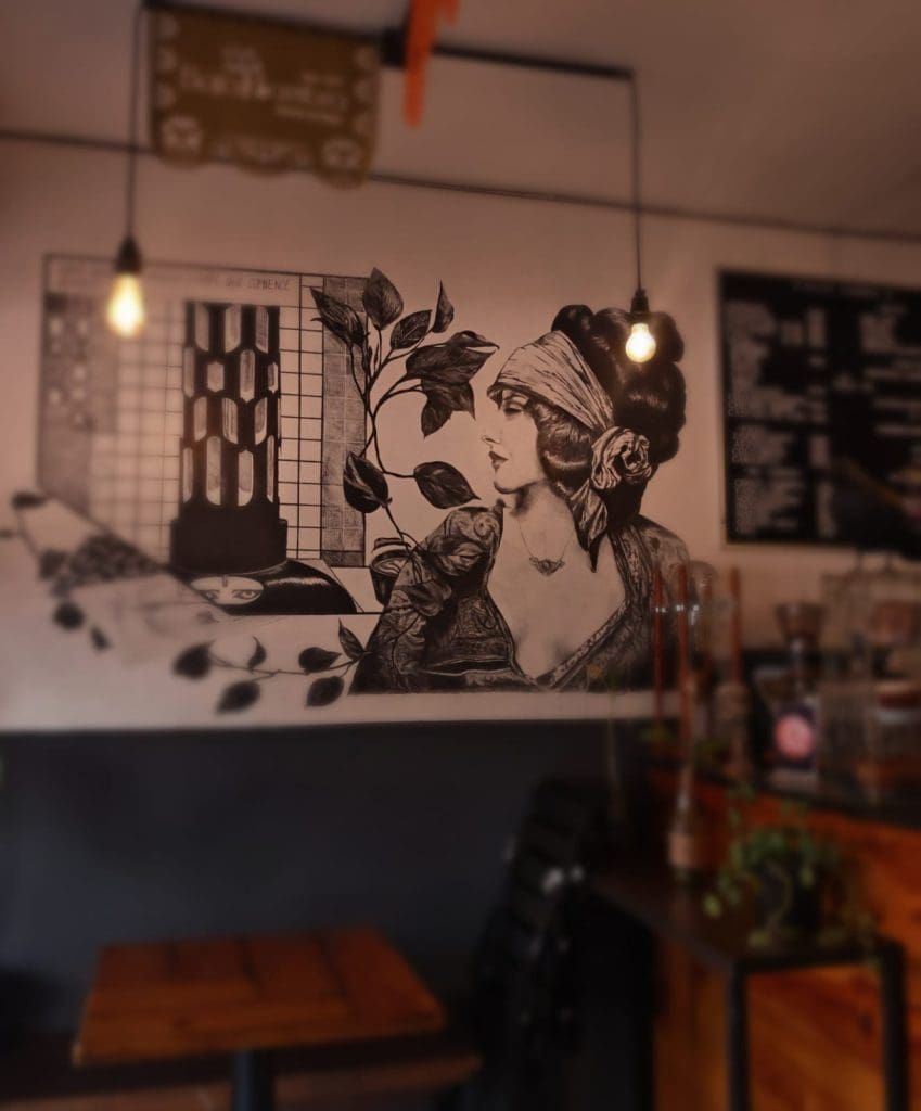 En la barra matriz tenemos un mural en donde hay unos ojos dibujados que son representativos de la banda Siouxsie and the Banshees que siempre ha sido inspiración y parte del soundtrack personal y del espacio. Casi nadie logra identificar o darse cuenta de ellos pero están ahí como gusto personal.
