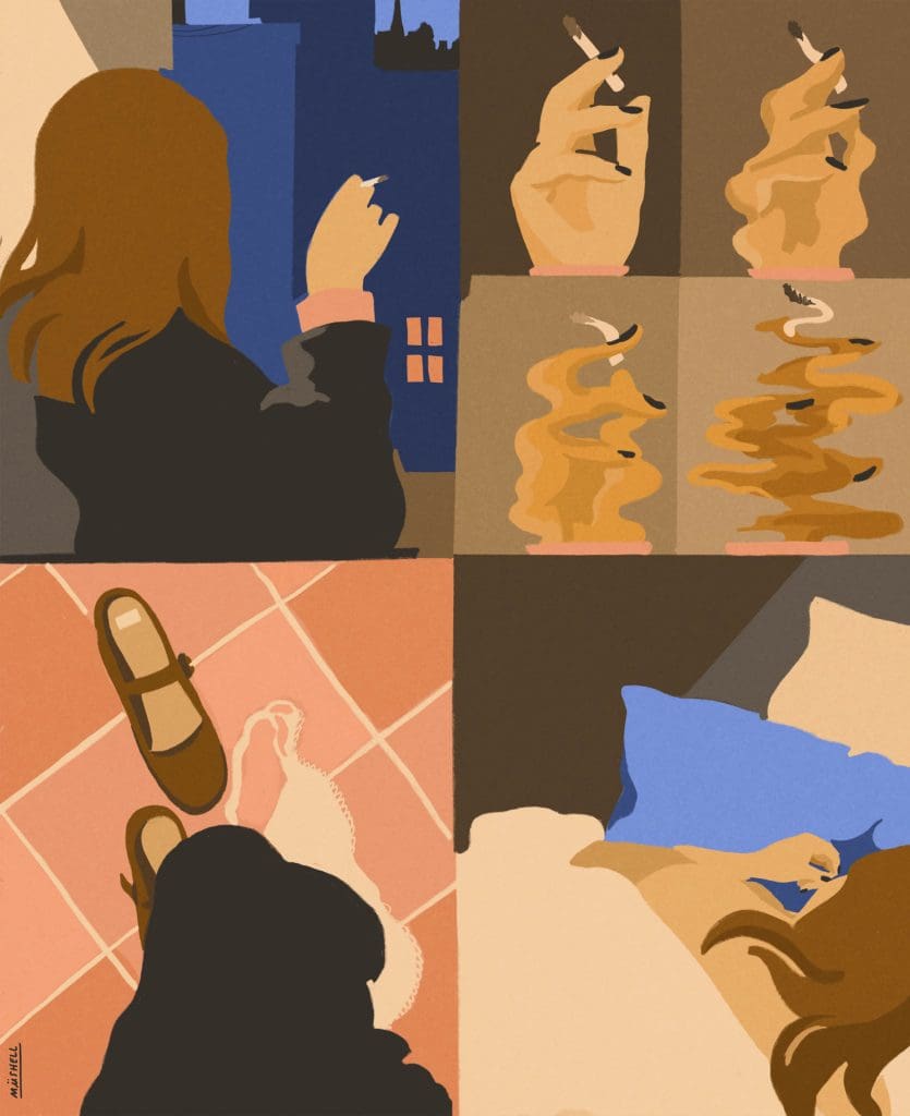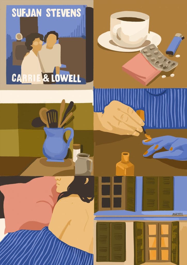 Music, film, and books always seep into my work. I recently rewatched Aftersun, by Charlotte Wells, and drew about it. I also drew panels featuring the cover of Carrie & Lowell from Sufjan Stevens, an album I often take with me on walks.