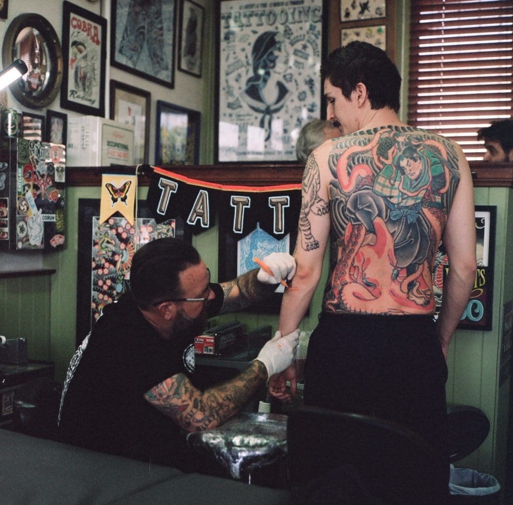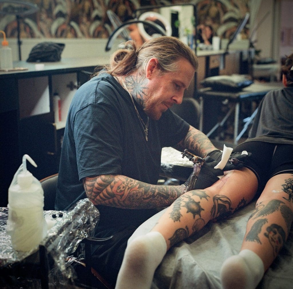 Despite usually engaging in street photography and photojournalism, I've been slowly formulating an idea for a photographic book on the art form and culture surrounding tattooing. I'm fascinated by the fact the art form is delivered on an organic, living medium, and done so with an act of sustained violence on a willing participant. Like film photography, it is analogue and messy and imperfect, and capturing the beauty in the violence is the goal of my work.