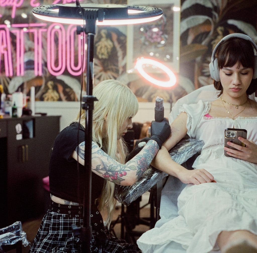 Intimacy is the key word. A client is literally letting an artist penetrate them with needles and ink, mixing fear and trust and rapture. I don't want to ever interrupt that, but I love to capture those moments between artist and client.