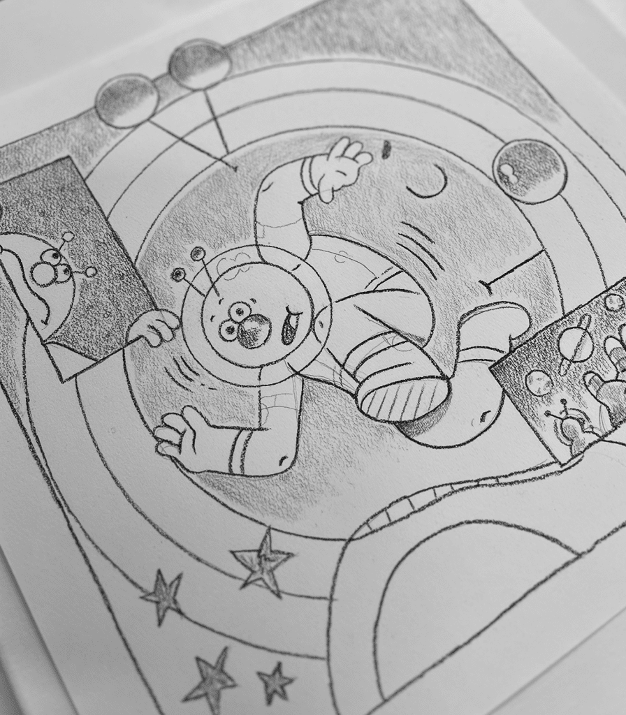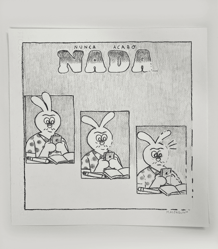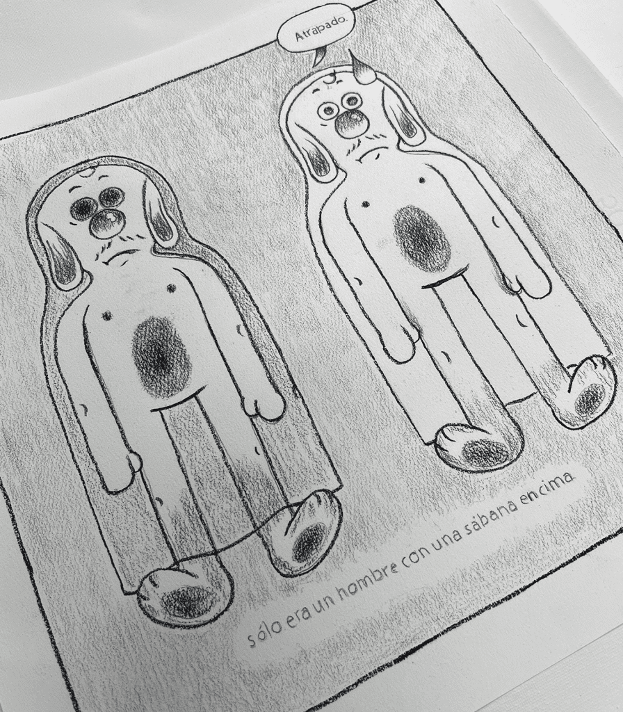 En lo que va del año me ha tocado un poco de todo: dibujé un libro, estuve armando cosas para el Grupo de Autoayuda de Dibujo, publiqué el cómic “Pastel de atún”, y en general dibujando mucho para una expo que tuve junto con David Espinosa “El Dee” que se llamó “Los cómics te romperán el corazón”. Justo en agosto 2025 fue el cierre de la misma dentro del espacio de Young Collectors en CDMX (el proyecto que nos ayudó a que la expo existiera) y luego montaje pop-up dentro de DOLOR LOCAL, un increíble bazar de arte-gráfica y publicaciones en Guadalajara. Creo que ese es el proyecto de gráfica al que más tiempo le dediqué los últimos meses, y donde más obra original generé en un buen rato.